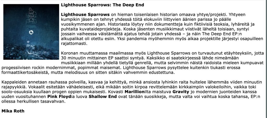 In summary, the Finns of ‘Lighthouse Sparrows’ release a remarkable first studio recording both in terms of compositions and production and if you like bands like ‘RPWL’ or ‘Airbag’ or even ou encore ‘Mystery’, you should like ‘Aerials’ which should be one of the major atmospheric progressive albums of 2022…